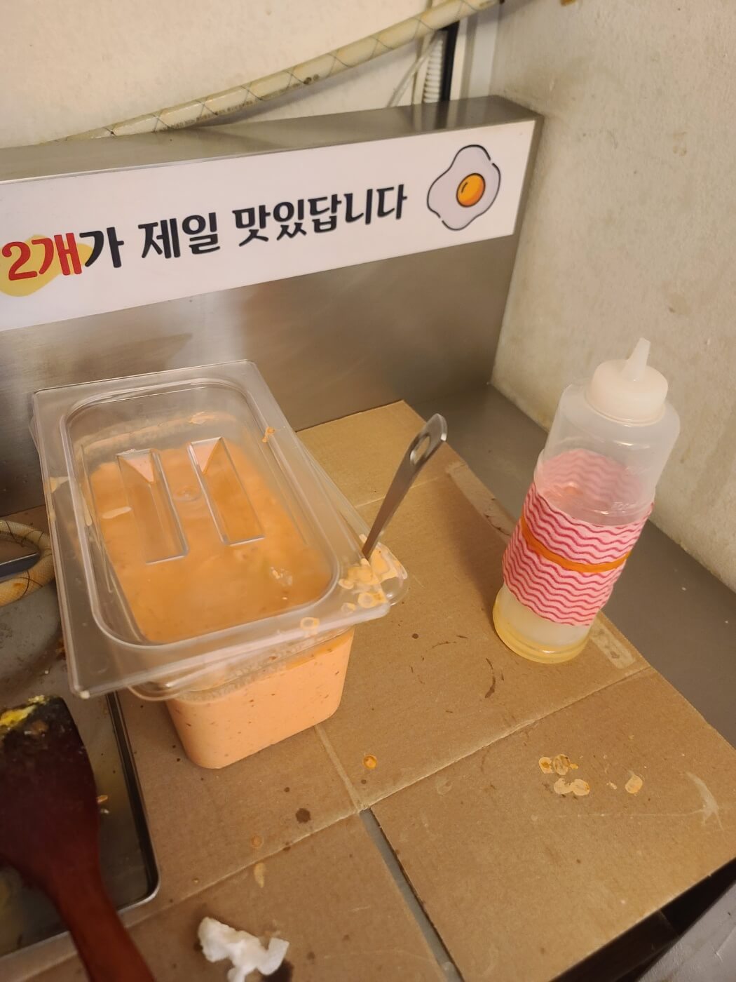 아쉬운 점은 작업대가 2 곳뿐이라, 계란프라이뿐이면 괜찮지만, 김치 부침개가 오래 걸리기 때문에 대기 줄이 상당합니다.