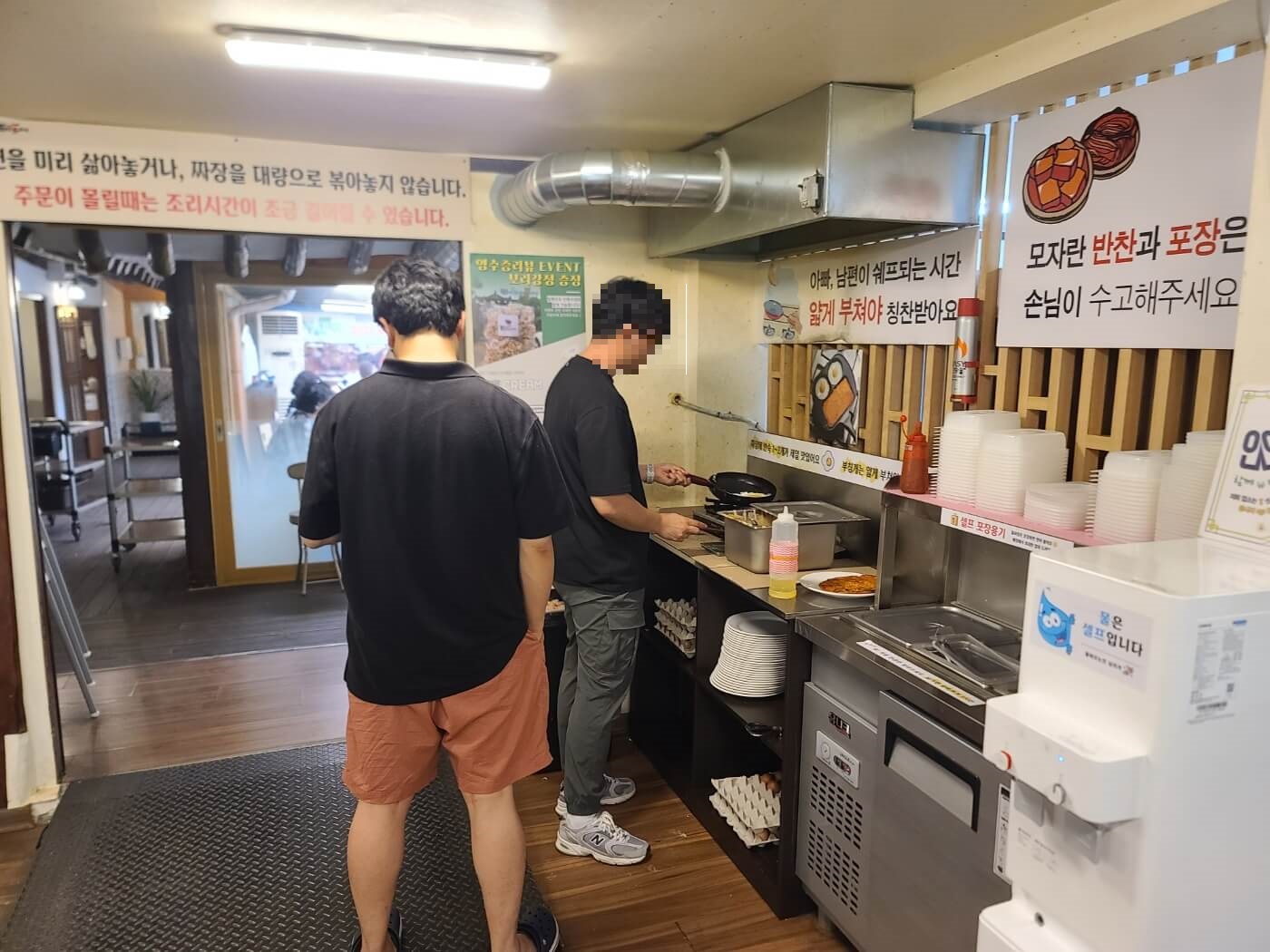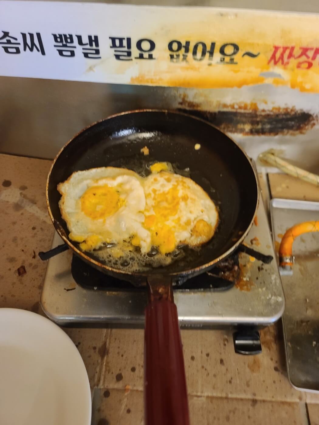 북한강돌짜장의 인기 비결 중 하나인 셀프 계란프라이와 김치 부침개입니다.
