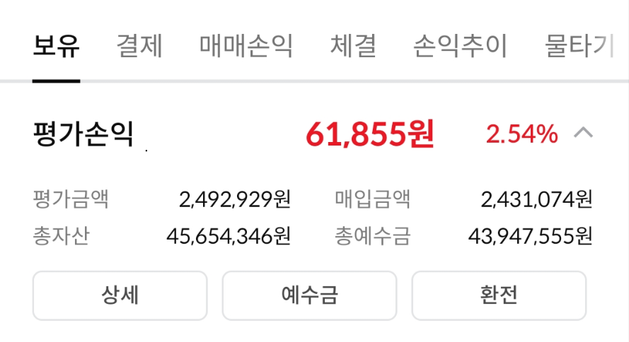 아래 이미지는 증권사 앱의 계좌 요약 화면입니다.