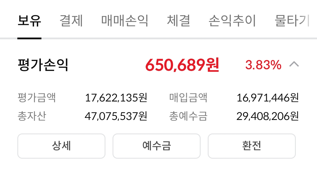 아래 이미지는 증권사 앱의 계좌 요약 화면입니다.