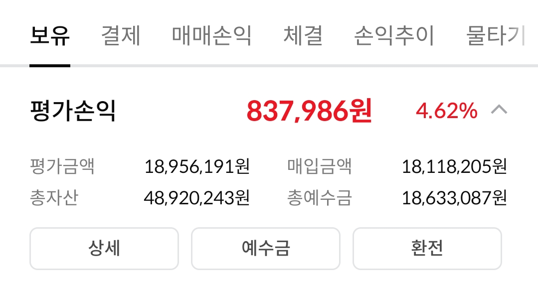 아래 이미지는 증권사 앱의 계좌 요약 화면입니다.