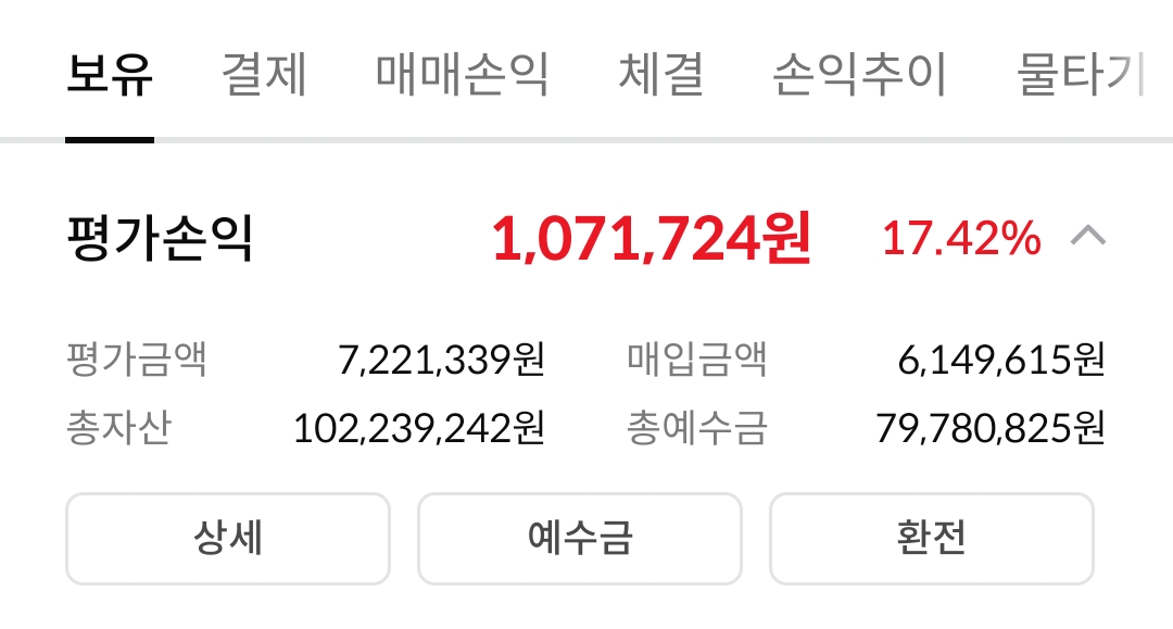 아래 이미지는 증권사 앱의 계좌 요약 화면입니다.